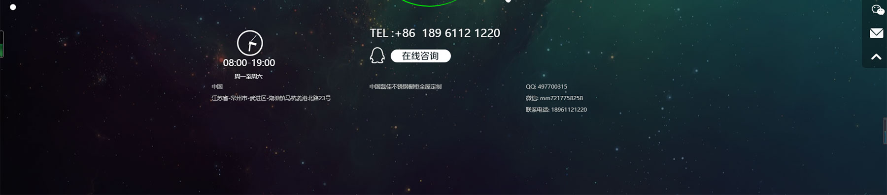 网站链接常州不锈钢橱柜网站建设——中国磊佳不锈钢厨卫科技有限公司,总部坐落于江苏省常州市武进区,占地总面积3万平方米公司前身源自1999年,专业从事高端不锈钢的研发制造,依托先进的工艺基础, 于2008年成立磊佳不锈钢艺术厨柜品牌,通过“设计+技术”创新,开创了中国不锈钢厨柜细分品类的先河。磊佳是国内不锈钢厨柜头部品牌,也是行业技术标准的发起和主编单位。经过12年深耕,产品线从单一的不锈钢厨柜延伸至衣柜、酒柜、餐边柜、浴室柜、阳台柜、电视柜、书柜、鞋柜等全屋定制柜类,是国内专精不锈钢家居、且品类最为齐全的一体化定制专家。多年来,磊佳始终坚持304不锈钢标准,以食品级环保和极致工匠精神,推动中国厨房向品质、健康、艺术的迭代升级,成为新一代民族品牌中的新国货代表!不锈钢厨柜是健康家居、绿色人居和社会可持续发展的必然趋势,一个家庭使用不锈钢橱柜,地球就少砍一棵树。保护森林,让青山绿水长留人间,让不锈钢厨柜走进每一个家庭,为人民创造更幸福美好的中国家,是磊佳恒久不变的愿景和价值。