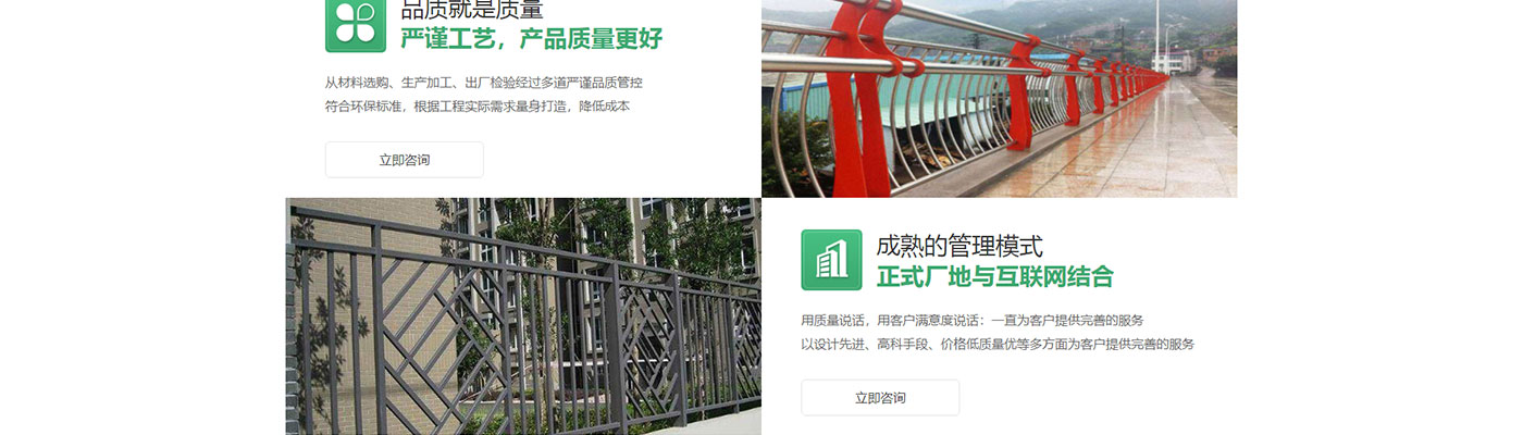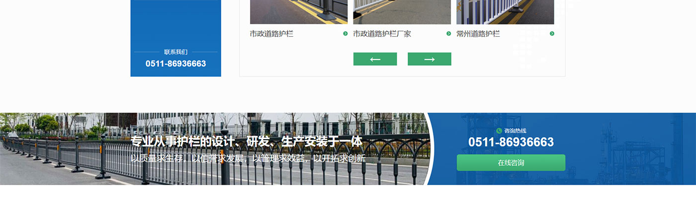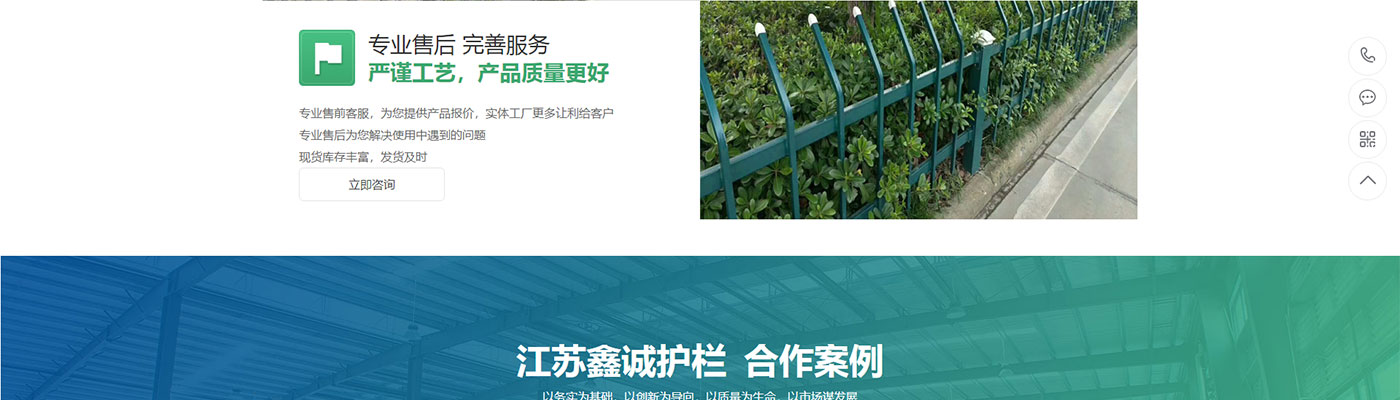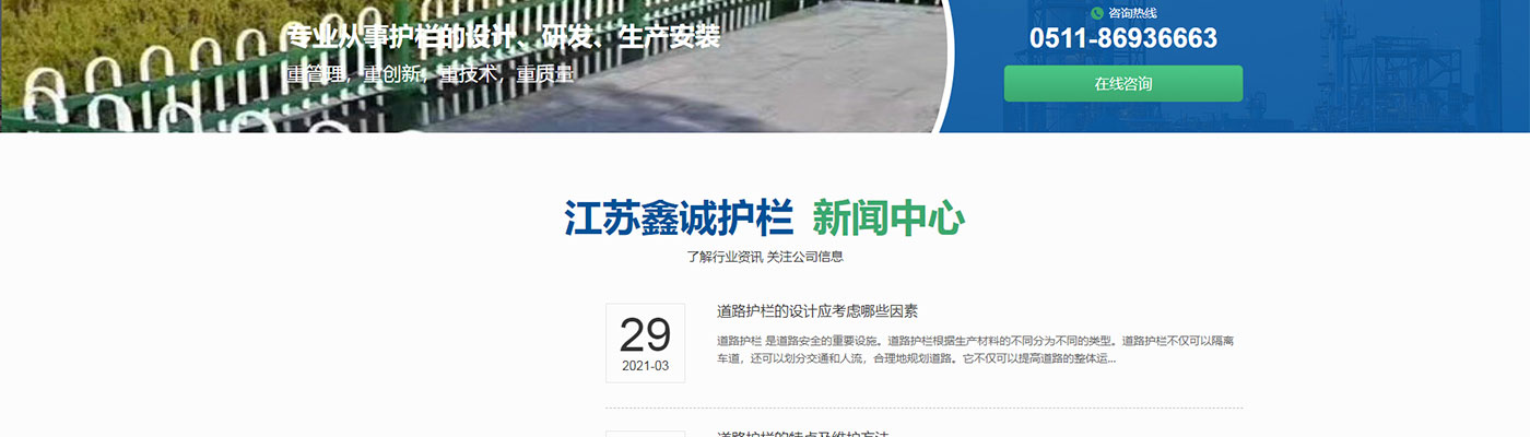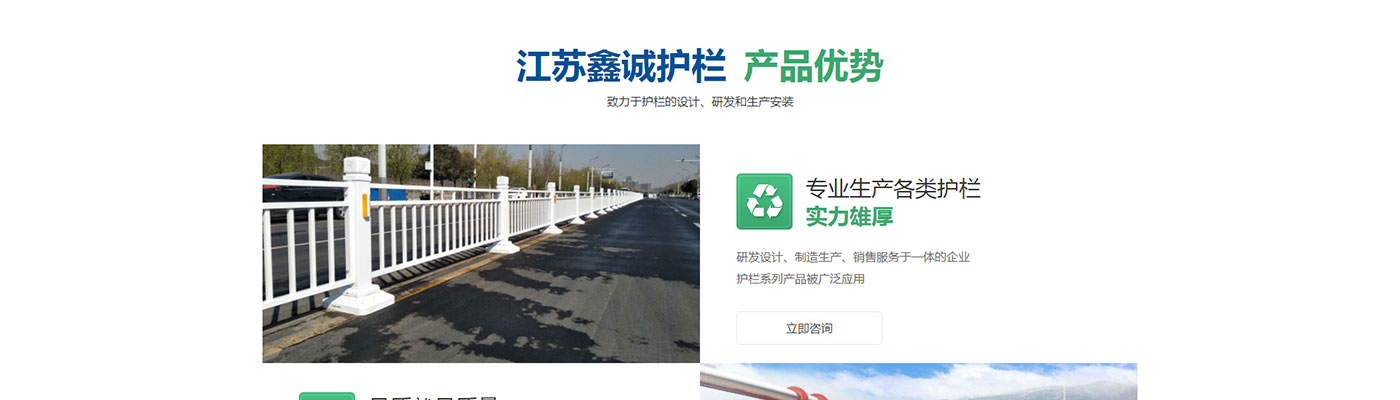 链接江苏营销型网站建设-江苏鑫诚护栏科技有限公司是一家从事护栏的设计、研发、生产安装于一体的民营企业。注册资金1288万元整,于丹阳市吕城镇,毗邻奔牛飞机场、沪宁高速,北邻长江,京杭运河,水陆交通十分便利,公司现有员工100多人,年生产能力120万米以上,拥有专业施工安装队伍及快速反应的售后服务部门。 企业是致力于生产销售交通护栏、市政护栏,文化护栏、京式护栏、园林护栏、建筑护栏、铝制护栏、铁艺护栏、的专业生厂家,设有生产基地、销售、研发中心等机构。根据我国护栏产品的现状和发展趋势,设计开发出数种护栏及配营产品。