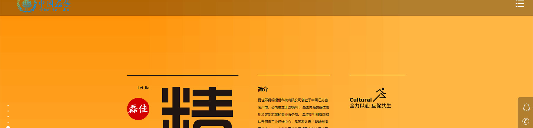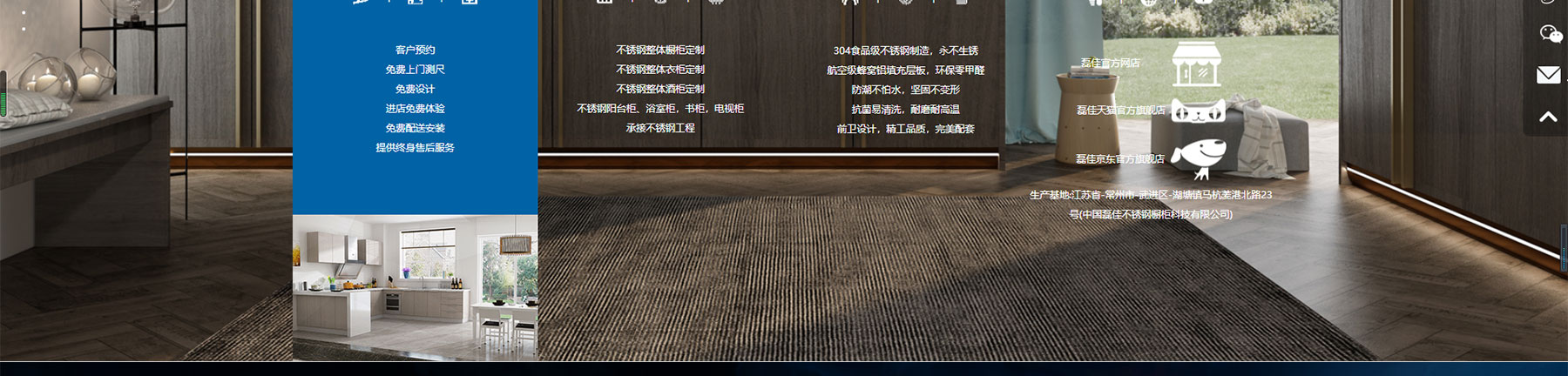 网站链接常州不锈钢橱柜网站建设——中国磊佳不锈钢厨卫科技有限公司,总部坐落于江苏省常州市武进区,占地总面积3万平方米公司前身源自1999年,专业从事高端不锈钢的研发制造,依托先进的工艺基础, 于2008年成立磊佳不锈钢艺术厨柜品牌,通过“设计+技术”创新,开创了中国不锈钢厨柜细分品类的先河。磊佳是国内不锈钢厨柜头部品牌,也是行业技术标准的发起和主编单位。经过12年深耕,产品线从单一的不锈钢厨柜延伸至衣柜、酒柜、餐边柜、浴室柜、阳台柜、电视柜、书柜、鞋柜等全屋定制柜类,是国内专精不锈钢家居、且品类最为齐全的一体化定制专家。多年来,磊佳始终坚持304不锈钢标准,以食品级环保和极致工匠精神,推动中国厨房向品质、健康、艺术的迭代升级,成为新一代民族品牌中的新国货代表!不锈钢厨柜是健康家居、绿色人居和社会可持续发展的必然趋势,一个家庭使用不锈钢橱柜,地球就少砍一棵树。保护森林,让青山绿水长留人间,让不锈钢厨柜走进每一个家庭,为人民创造更幸福美好的中国家,是磊佳恒久不变的愿景和价值。